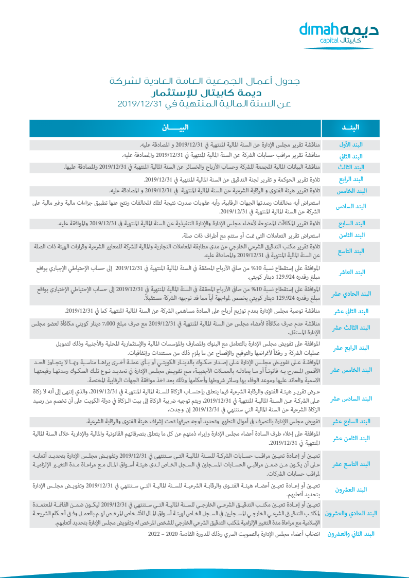 Dimah Capital publishes the Annual Report for the year 2019 and the agenda for the assembly.