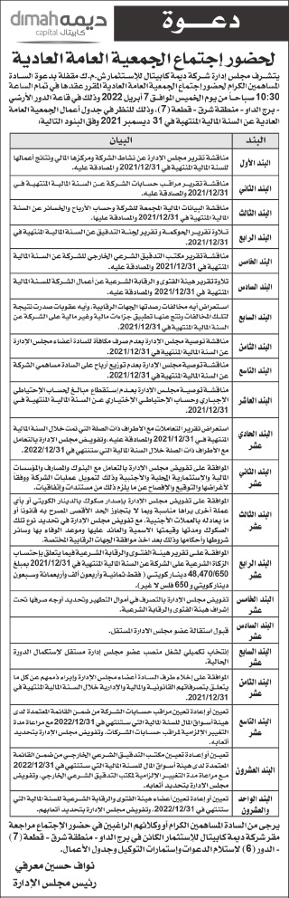 The board of directors of Dimah Capital Investment Company (closed joint stock company) is pleased to invite its esteemed shareholders to attend the ordinary general assembly meeting scheduled to be held on Thursday, April 7, 2022 at 10:30 am, in the ground floor hall of Dow Tower, East Area, Block (7).