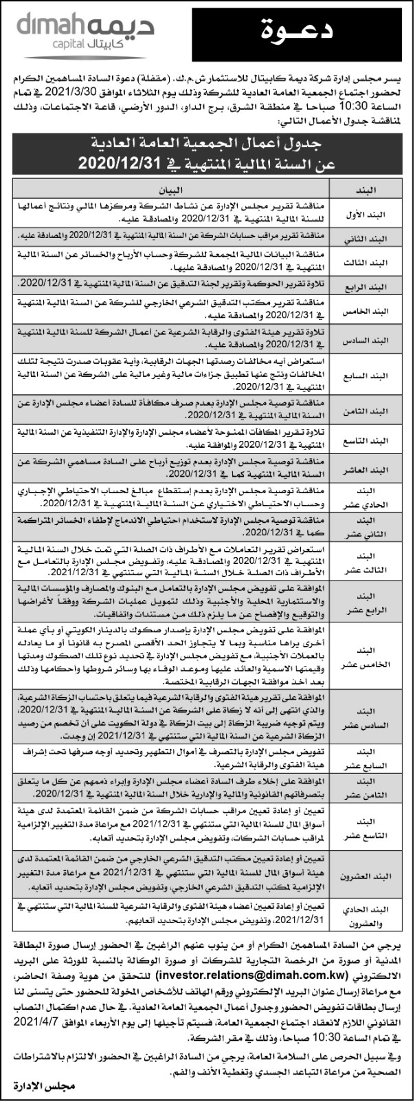 Inviting the honorable shareholders to attend the Ordinary General Assembly meeting of Dima Capital Investment Company