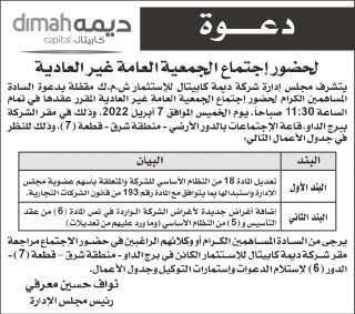 Invitation to attend the extraordinary general assembly meeting. The board of directors of Dimah Capital Investment Company (closed joint stock company) is pleased to invite its esteemed shareholders to attend the ordinary general assembly meeting scheduled to be held on Thursday, April 7, 2022 at 11:30 am, in the ground floor hall of Dow Tower, East Area, Block (7).